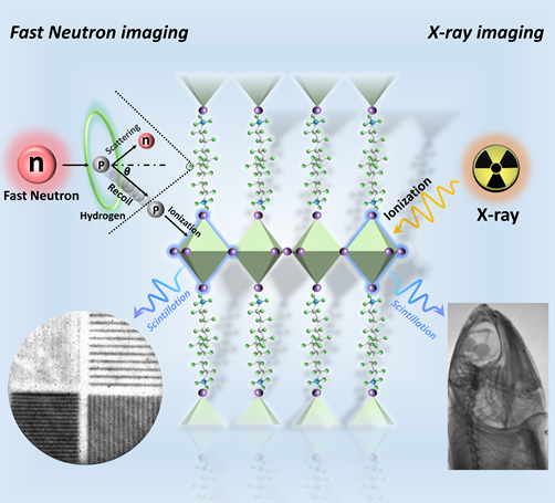 在题为“Synergy of Organic and Inorganic Sites in 2D Perovskite for Fast Neutron and X-Ray Imaging”的成果中,针对X射线和快中子与物质相互作用截面完全相反的问题,研究团队设计了一种有机-无机杂化结构的金属卤化物钙钛矿以满足在单一材料框架内实现X射线和快中子两种辐射场的成像。该研究通过对于快中子和X射线与物质相互作用的不同的物理机制的分析和模拟,提出利用有机-无机杂化闪烁体中的富集氢元素的有机位点和含有重元素的无机位点协同作用的概念以实现在单一材料体系中进行互补的快中子和X射线的探测。其中,快中子成像部分在东莞散裂中子源进行,这种有机-无机杂化金属卤化物钙钛矿闪烁体展现出与商业的ZnS (Ag)/6LiF闪烁体可比拟的闪烁亮度和分辨率,这项研究成果展现出其在快中子和X射线混合场成像中的应用潜力。