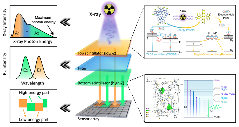 图2. 叠层闪烁体的结构以及在双能X射线成像中的工作机理图